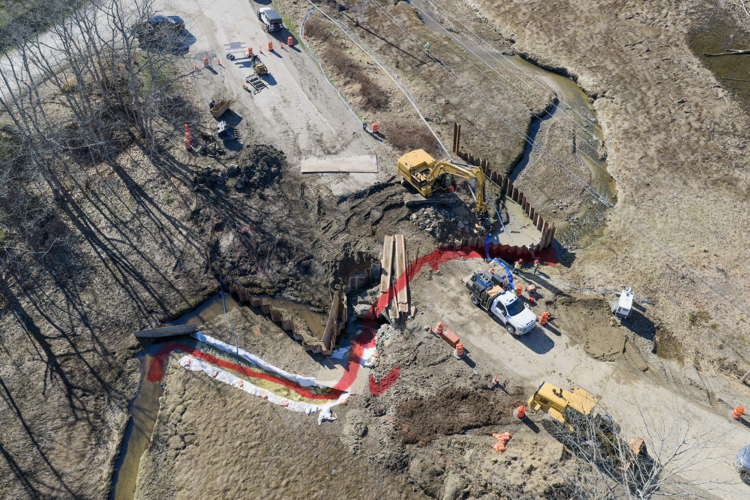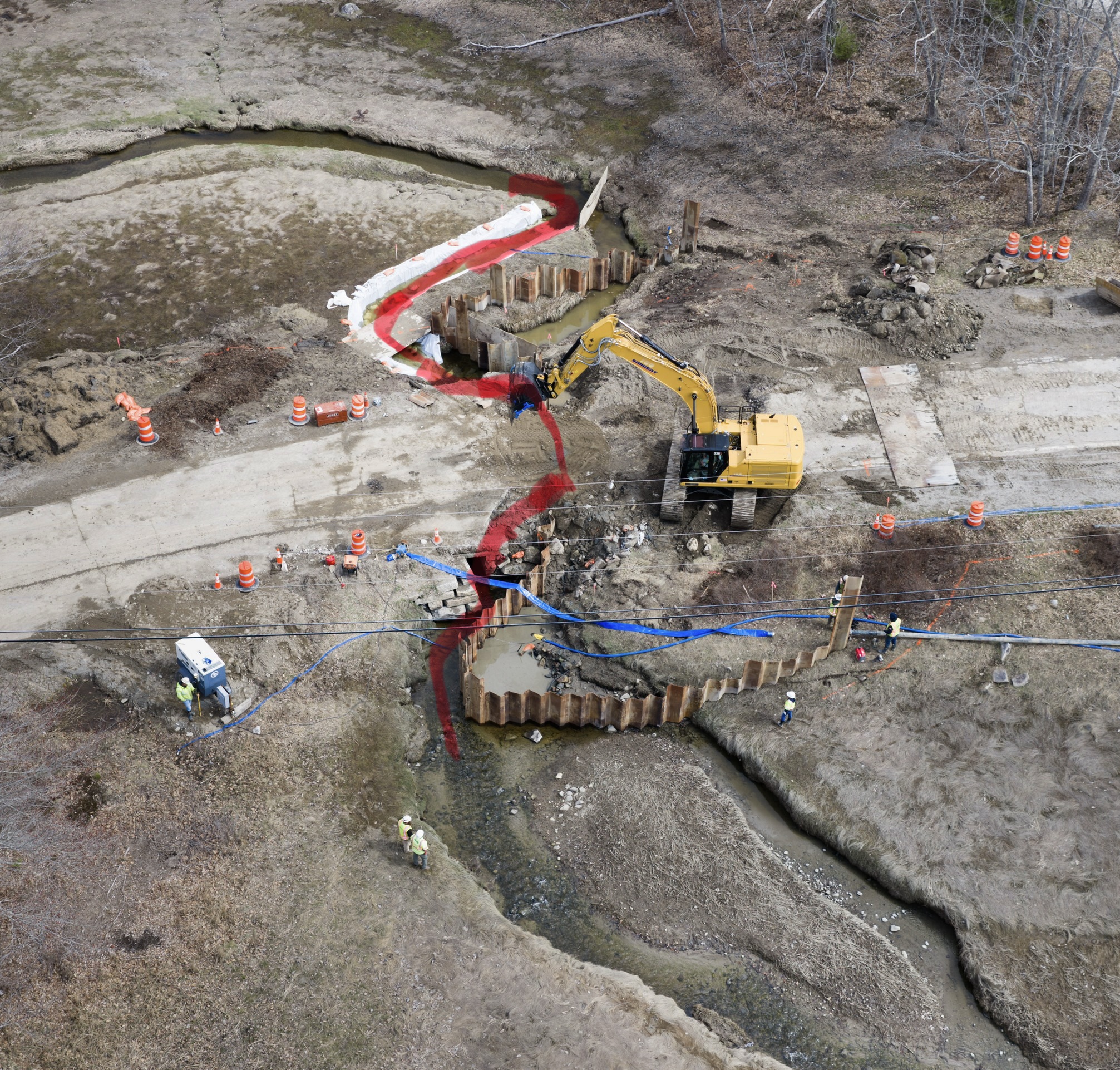 For those with questions regarding permitting and water flow at the Mill Creek project, the attached aerial photos provide clarity: The area highlighted in red shows the active water flow. While the checkmark indicates a temporary footbridge for workers, it may give the impression that water flow ends at that point, which is not the case. Water flow is continuous throughout the project area, and all permits strictly prohibit flow stoppage to ensure uninterrupted fish passage at all times.
