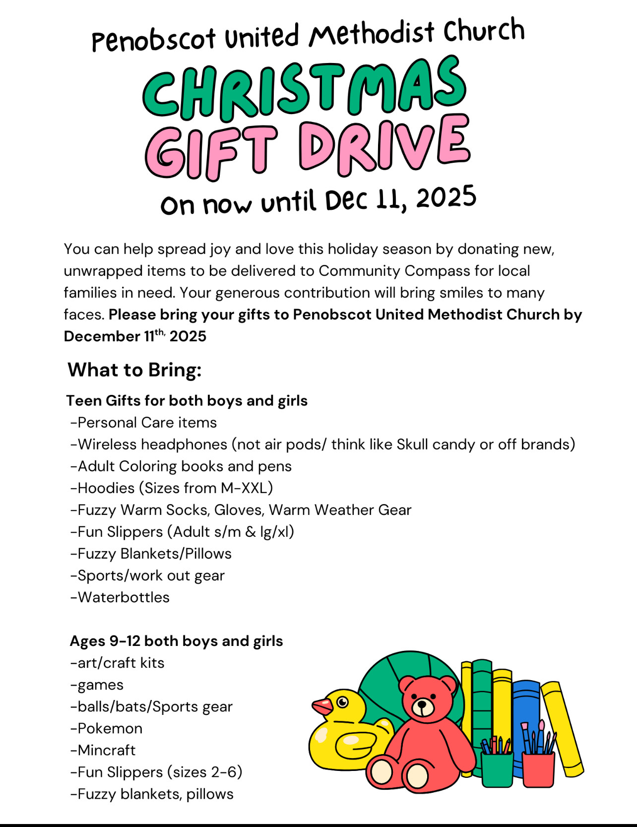 Penobscot Methodist Christmas Gift Drive is going on now through December 11.