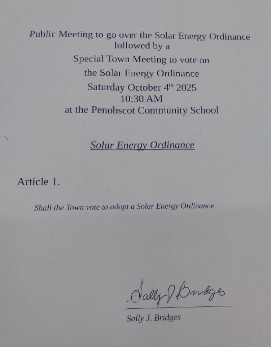 There will be a Solar Energy Ordinance public meeting October 4 at 10:30 AM at the Penobscot School followed by a town vote. The latest draft dated July 8, 2025 (the most current) for your review is located here.