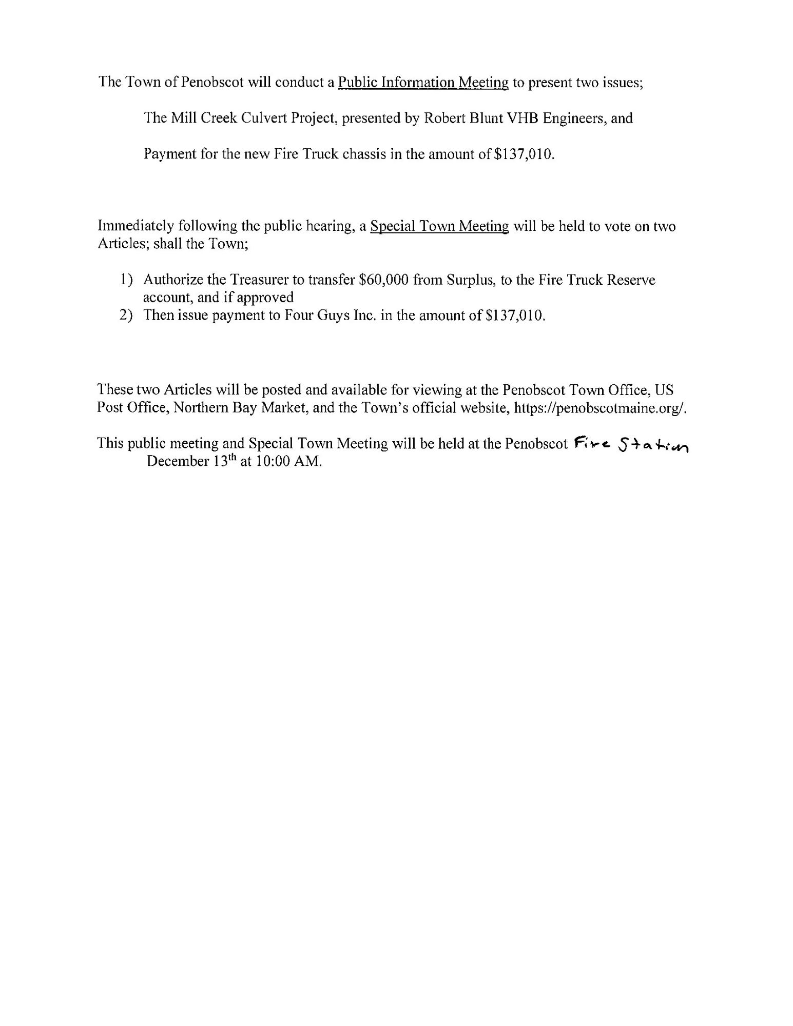 Save the date! Informational Meeting on Mill Brook (aka Mill Creek) culvert project and Special Town Meeting to authorize fund transfer then payment for the fire truck chassis.