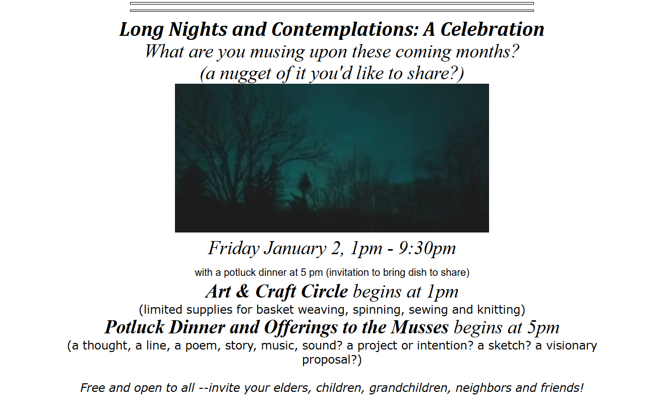 Art and Craft Circle at 1PM and a Potluck at 5PM. Free and open to all! Bring friends and family! Bring a favorite dish to share!