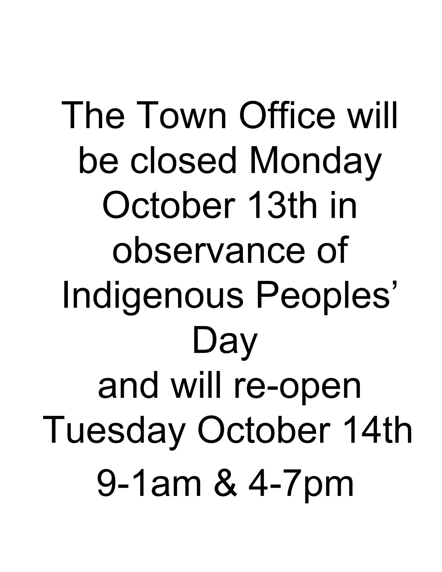 The town office will be closed Monday October 13 in observance of Indigenous Peoples' Day.