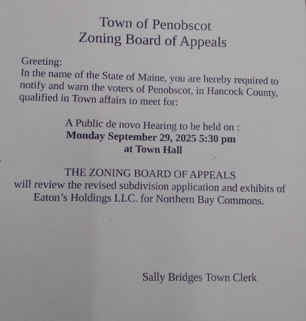 Today! Zoning Board of Appeals to meet on the Northern Bay Commons subdivision Sept 29 August 1, 2025 The meeting is at the town office, 5:30PM.