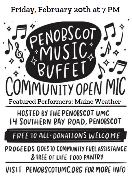 Penobscot’s monthly musical event, The Music Buffet, is held once a month on Fridays in the annex of the Penobscot United Methodist Church. All are welcome to come hear and share a wide variety of music during the open-mic hour beginning at 7 p.m. At 8 p.m., a featured artist takes the stage.